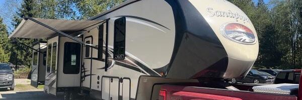 This 2016 Forest River Sandpiper is a fifth-wheel travel trailer that is in good condition. Notably, the trailer is currently missing furniture, offering a blank canvas for personalization. The exterior shows signs of wear including faded paint, a creased dent on the right side, and moisture-related issues that may be causing delamination on the left panel. However, the structure remains sound with operational windows and a stable roof.