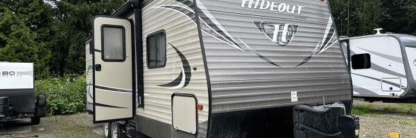 The 2017 Keystone Hideout travel trailer is in good condition. The exterior shows some wear with loose parts at the front and faded paint on both sides, but it remains towable and intact. The tires are in fair condition, ensuring roadworthiness. It features a functional kitchen with operational appliances. The interior structure, including the walls, flooring, and ceiling, is generally in good condition. This trailer is experiencing electrical issues causing the slide and awning to malfunction.