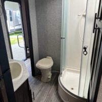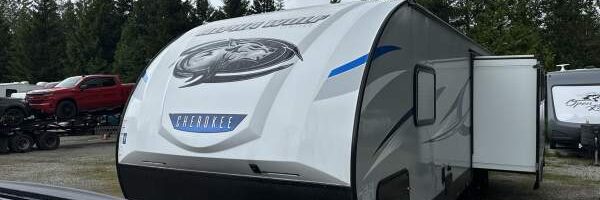 The 2018 Cherokee Alpha Wolf Limited travel trailer is in good condition. The exterior is in good condition with some chips and creases, particularly on the front and left side, but it remains towable and intact. The kitchen appliances, bathroom fixtures, air conditioning, heating, and entertainment systems are operational. This trailer includes one bed and offers a spacious layout that, with some dedicated refurbishment, can be transformed into a comfortable living space.