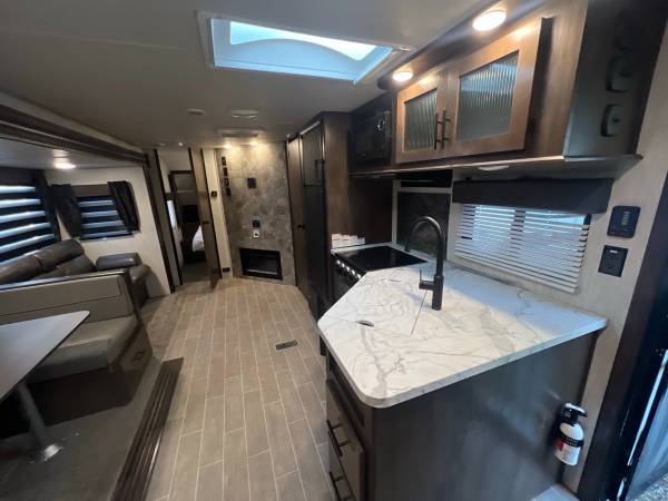 This 2020 Forest River Cherokee 264DBH is in good condition. Equipped with a single key, this trailer includes a spacious interior with a dinette, couch, and a fully functional kitchen featuring a stove, sink, refrigerator, and microwave. ​ The bathroom is well-appointed with a toilet, sink, and shower, while the bedroom and lounge offer cozy sleeping and relaxation spaces. Additional features include a fireplace, AM/FM/CD stereo system, and air conditioning and heating for year-round comfort. While the trailer is in good overall condition, it has minor cosmetic issues such as peeling decals, a broken door lock, and some wear on the awning and interior walls. With its practical layout and amenities, this trailer is ideal for family adventures or extended trips. ​