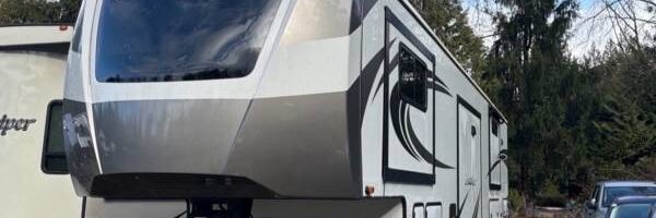 This 2022 Forest River Sandpiper 391FLRB is in good condition. Equipped with slides, this unit includes essential amenities such as a stove, sink, refrigerator, microwave, fireplace, AM/FM/CD stereo system, and television. It has two beds, a functional bathroom with a toilet, sink, and shower, and a main bedroom. The exterior has some damage, including loose kitchen tiles, scratches, and a back storage compartment affected by weather elements. The roof has soft spots due to moisture, and the first bathroom door near the kitchen requires force to open.