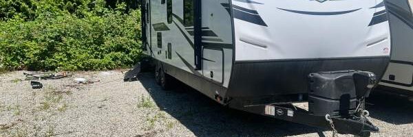 The 2022 Heartland Sundance 262RB is in good condition. It features a sleek white exterior and is equipped with essential amenities. The unit includes a spacious bedroom with a single bed, a fully functional bathroom with a shower, toilet, and sink, and a well-appointed kitchen with a stove, refrigerator, microwave, and sink. The living and dining area is furnished with a cozy couch and a dinette. Please note that the bathroom door has some holes in it.