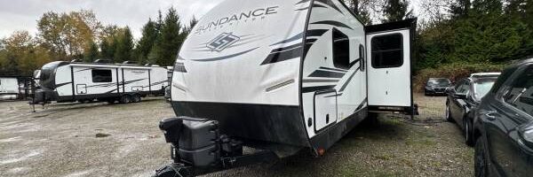 The 2022 Heartland Sundance 265BH Travel Trailer is in good condition. It offers a spacious and functional design, perfect for family adventures. With a sleek white exterior and durable build, this towable unit features a comfortable interior equipped with three beds, a fully functional kitchen with a stove, sink, refrigerator, and microwave, as well as a bathroom with a shower, sink, and toilet. The living area includes a dinette, couch, and entertainment system with a television and AM/FM/CD stereo. ​ Additional features include an awning for outdoor relaxation, air conditioning, heating, and ample storage space. ​ While the trailer is in good condition with minor issues like a bent stair and cabinet damage, it remains a reliable option for travel and leisure.