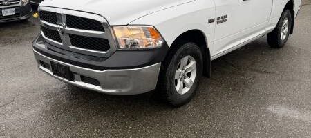 This 2017 Ram 1500 Tradesman Quad Cab 4WD is in good condition. Featuring a powerful gasoline engine with automatic transmission and 4-wheel drive, it ensures a smooth and capable performance on various terrains. The truck boasts a clean white exterior with minimal wear, including a minor scratch on the driver rear quarter panel, and is equipped with alloy rims and tires in fair condition. The interior is spacious, with well-maintained upholstery, front heated seats, and a functional air conditioning system.
