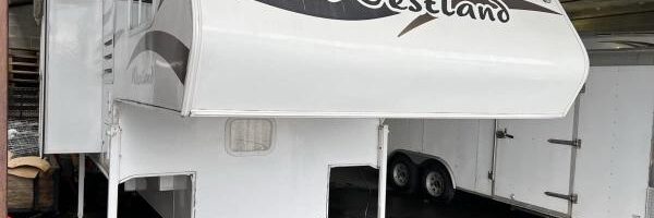 This 2018 Travelaire Truck Camper 80WSL is in good condition. This model, while used, comes in white and is capable of being towed to your next destination with ease. The exterior shows some signs of wear, including cracked paint and loose parts, but it remains structurally sound. The interior, rated at 20%, offers basic amenities including a functional stove, refrigerator, and a passable dinette area, though it does come with some challenges such as a lack of equipped furniture and some signs of moisture around the windows and entry areas.