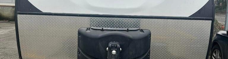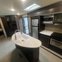 This 2018 Kodiak 331BHSL is in fair condition. Featuring a white exterior, the unit is equipped with multiple slide-outs to maximize interior space. The trailer includes five beds, a full kitchen with a stove, microwave, and refrigerator, as well as a bathroom with a functional toilet, sink, and shower (though the shower door is off track and the showerhead is dismantled). The living area offers a dinette, a couch with a soft spot on the right cushion, and an AM/FM/CD stereo system. While the interior is in overall good condition, the carpet is stained, and the television is missing. The exterior has minor wear, including a cracked wheel well and multiple areas covered with red duct tape.