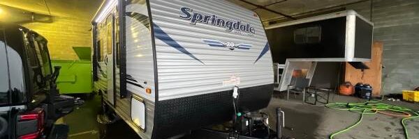 This 2019 Keystone Springdale 1700FQ is in good condition. Designed for functionality and convenience, this unit features a compact interior equipped with one bed, a full bathroom including a toilet, sink, and shower, and a kitchen area with a stove, refrigerator, and microwave. The interior dinette has some loose parts. Overall, the trailer remains in good condition.