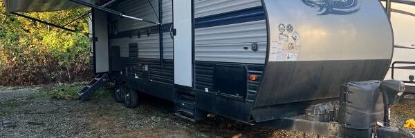 This 2020 Forest River Cherokee 264DBH is in good condition. Equipped with a single key, this trailer includes a spacious interior with a dinette, couch, and a fully functional kitchen featuring a stove, sink, refrigerator, and microwave. ​ The bathroom is well-appointed with a toilet, sink, and shower, while the bedroom and lounge offer cozy sleeping and relaxation spaces. Additional features include a fireplace, AM/FM/CD stereo system, and air conditioning and heating for year-round comfort. While the trailer is in good overall condition, it has minor cosmetic issues such as peeling decals, a broken door lock, and some wear on the awning and interior walls. With its practical layout and amenities, this trailer is ideal for family adventures or extended trips. ​