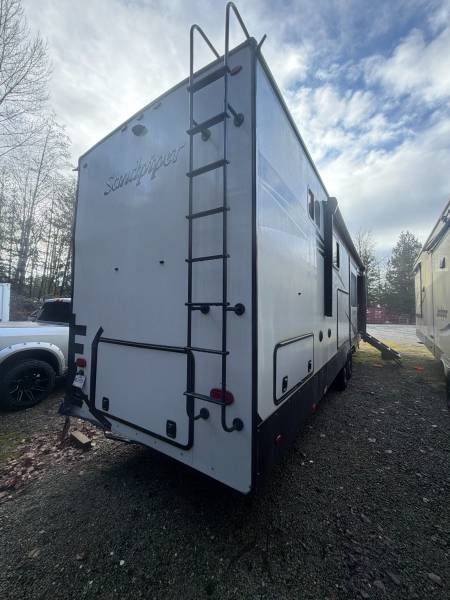 This 2022 Forest River Sandpiper 391FLRB is in good condition. Equipped with slides, this unit includes essential amenities such as a stove, sink, refrigerator, microwave, fireplace, AM/FM/CD stereo system, and television. It has two beds, a functional bathroom with a toilet, sink, and shower, and a main bedroom. The exterior has some damage, including loose kitchen tiles, scratches, and a back storage compartment affected by weather elements. The roof has soft spots due to moisture, and the first bathroom door near the kitchen requires force to open.